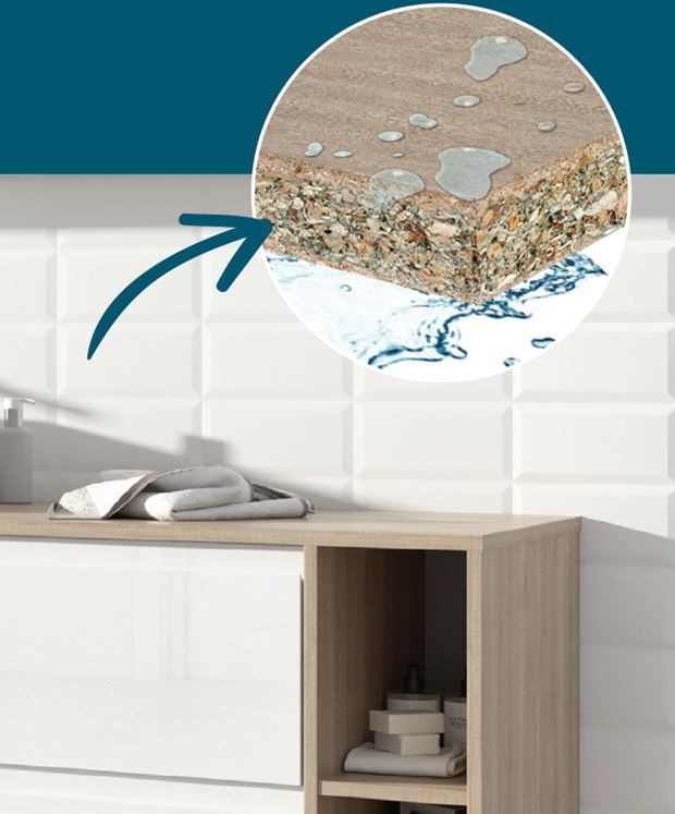 Stolní deska v dubovém provedení je dřevotřísková deska odolná proti vlhkosti díky moderní technologii AQUASAFE.