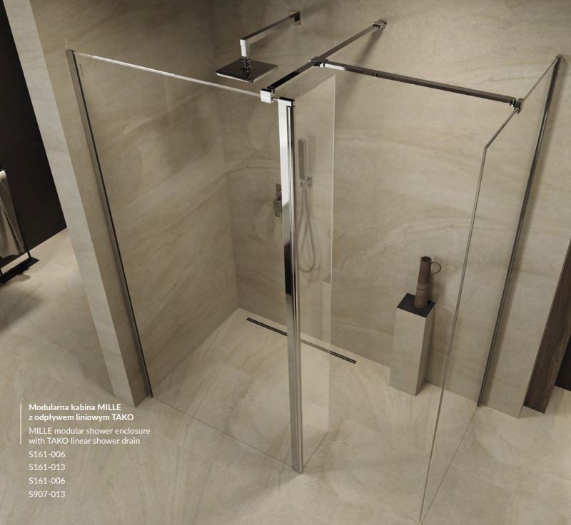 Sprchové zástěny WALK-IN jsou k dispozici ve čtyřech velikostech a ve dvou nejmódnějších barevných variantách: chrom a černý mat. MILLE WALK-IN lze instalovat se sprchovými vaničkami nebo sprchovým kanálkem. Nepochybnou výhodou tohoto produktu je také jeho výška - do 200 cm a síla tvrzeného skla - 8 mm, kdy je stěna velmi pevná a stabilní. Není tak zapotřebí rámování. Sklo je navíc opatřeno ochranným nátěrem CleanPro, který zabraňuje tvorbě vodního kamene a nečistot, což vám následnou péči a úklid značně zjednoduší.
