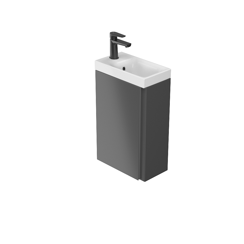 Sestava se skládá z umyvadlové skříňky MODUO a keramického umyvadla MODUO 40. Čela skříňky jsou vyrobena z lakované nábytkové MDF desky antracitové barvy s matným povrchem. Otvírání je univerzální, její orientaci si zvolíte při její montáži. Skříňky série MODUO mají pohodlné frézované úchyty, které vytváří dekorativní prvky a umožňují jednoduché otevírání a zavírání dveří nebo šuplíků. Dvířka jsou vybavena systémem měkkého zavírání.