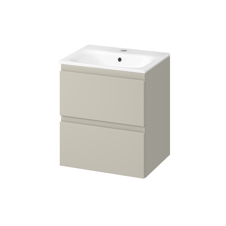Sada obsahuje skříňku pod umyvadlo MODUO v provedení pro samoobslužnou montáž a umyvadlo na desku /zápustné/ MODUO 50. Čelo skříňky je vyrobeno z MDF desky v kašmírové barvě s matným povrchem. Skříňka má dvě zásuvky po celé délce, pohodlné frézované úchytky a systém tlumení. Doporučujeme použít prostorově úsporný sifon.