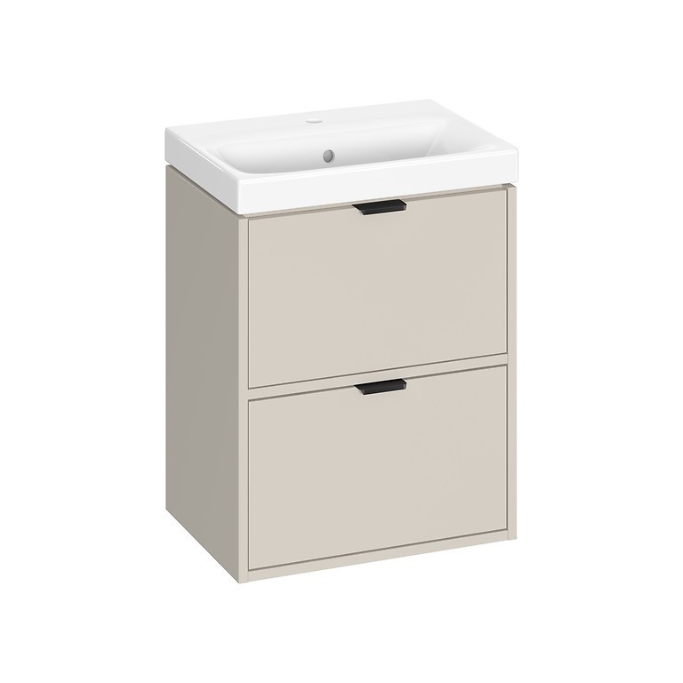 Skříňka s umyvadlem ATRATO SLIM 50 v elegantním odstínu kašmír dodá vaší koupelně moderní a sofistikovaný vzhled. Díky závěsnému provedení působí vzdušně a zároveň usnadňuje úklid podlahy. Vyrobena je z kvalitní laminované dřevotřísky o tloušťce 16 mm, která zajišťuje odolnost vůči vlhkosti a každodennímu používání. Dvě prostorné zásuvky s plným dnem poskytují praktický úložný prostor pro kosmetiku či čisticí prostředky.