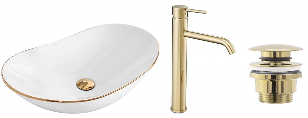 Představujeme vám moderní a maximálně funkční set umyvadla na desku ROYAL, vysoké baterie LUNGO a univerzální zátky. Umyvadlo na desku Rea o rozměrech 62,5x36 cm je vyrobené z vysoce kvalitních materiálů a splní požadavky všech, kteří si cení kvality. Díky harmonickým liniím se perfektně hodí k jakémukoli stylu, tomu modernímu i klasickému. Efektivní tvar mu dodává lehkost, což znamená, že můžete umístit dvě umyvadla vedle sebe. Vedle umyvadla umístíte 28 cm vysokou umyvadlovou baterii v moderním zlatém provedení a pro dokonalý vzhled sladíte s výpustí stejné barvy jako je baterie.