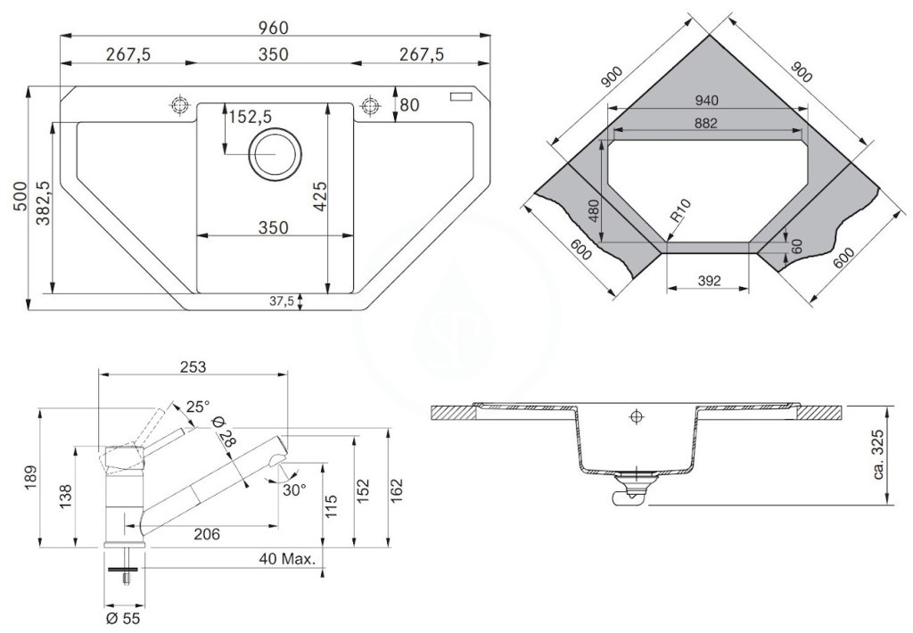- dřez: 350 × 425 × 200 mm