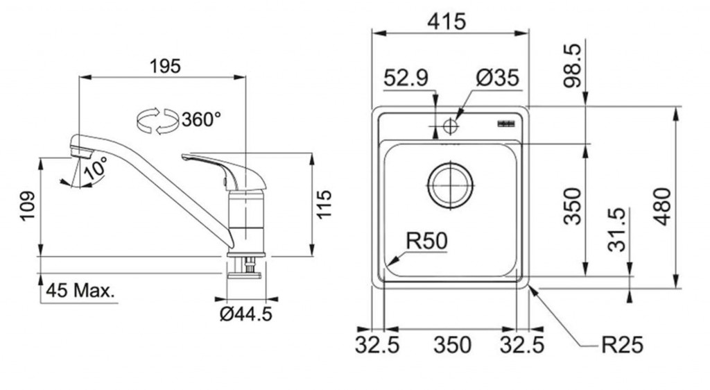 - dřez 350 x 350 mm