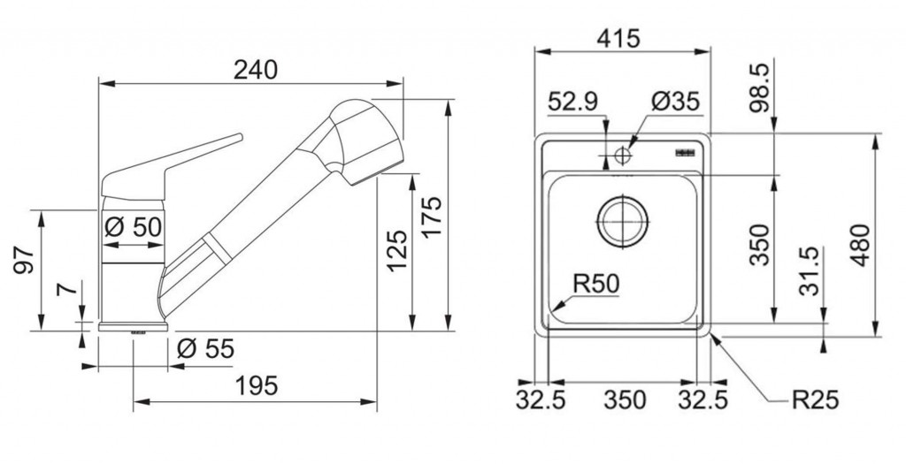 - dřez 350 x 350 mm