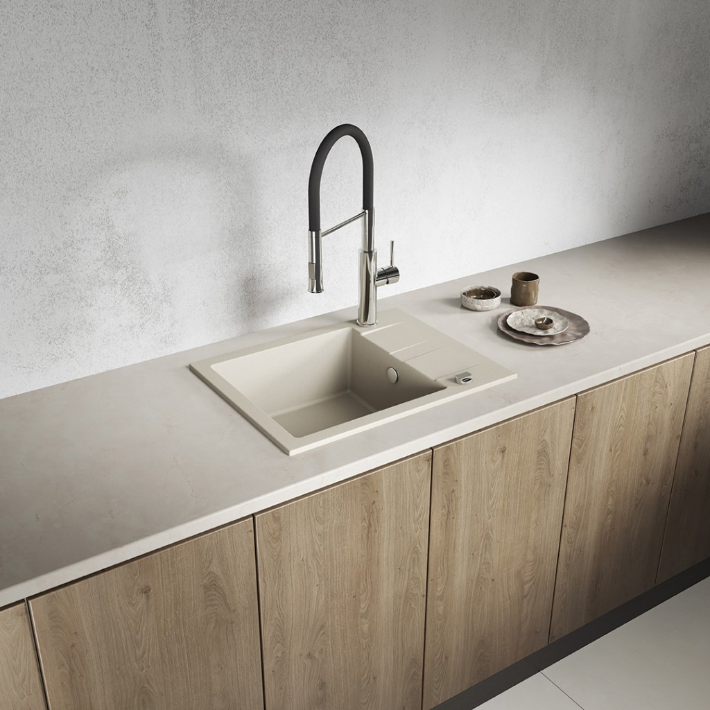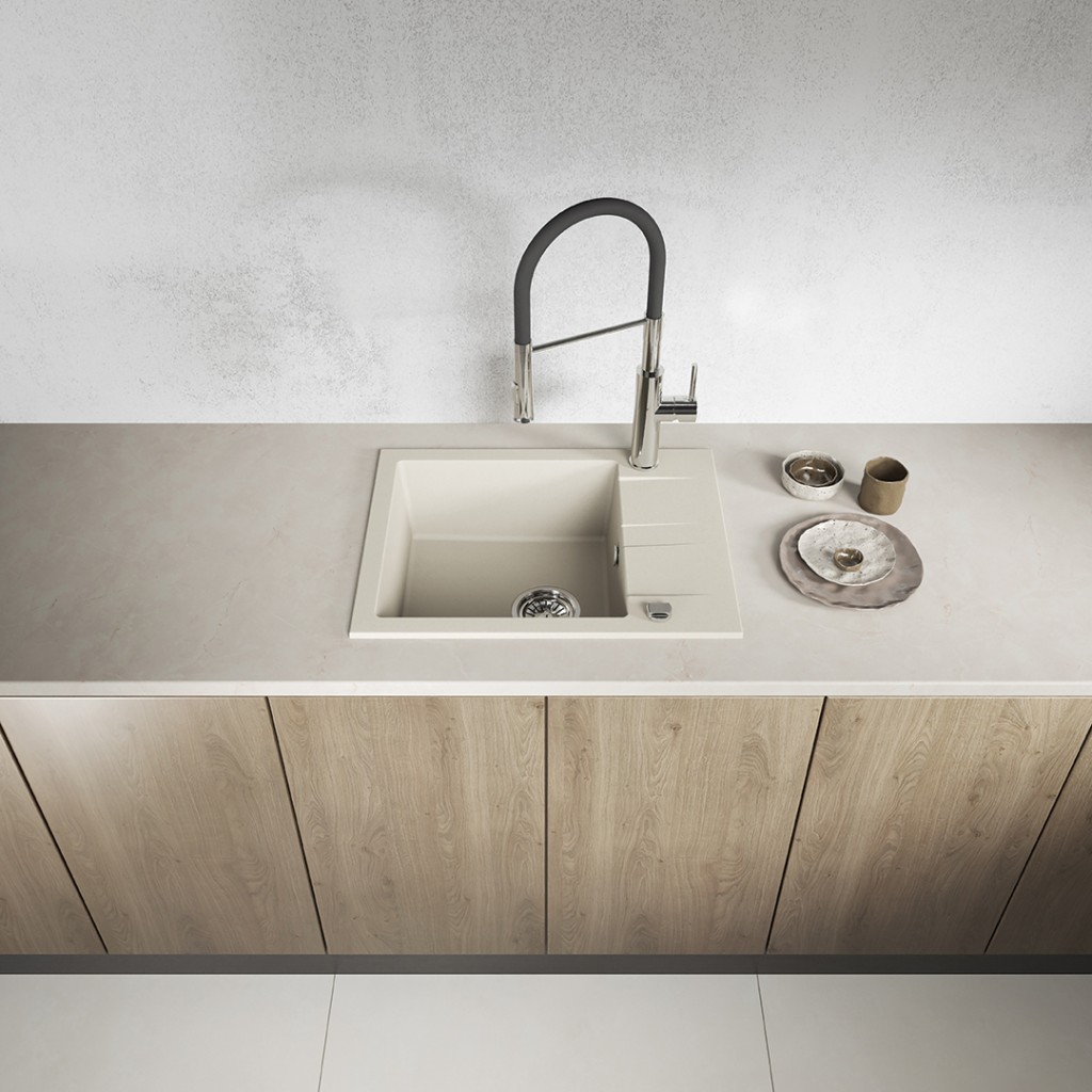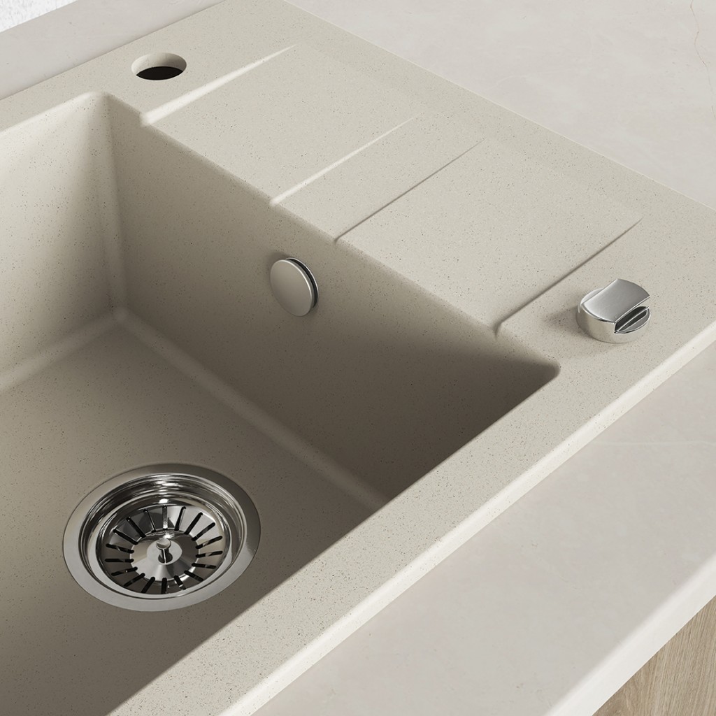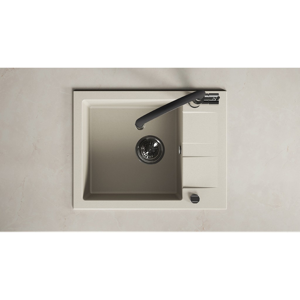 Béžový jednodřez SHIRE z granitu s odtokem je elegantním a praktickým řešením, které se hodí do malých i větších kuchyní. Jeho univerzální odstín dokonale doplní skandinávský, boho, klasický i moderní interiér. Díky kompaktním rozměrům (440 x 570 mm) a možnosti oboustranné montáže umožňuje SHIRE snadné přizpůsobení uspořádání vaší pracovní desky, zatímco hluboká mísa (170 mm) a funkční odtok zajišťují pohodlí při každodenním používání. Dřez je vyroben z odolné granitu, je odolný vůči poškrábání, změně barvy, nárazům a teplotám až do 250 °C. Je vybaven přepadem, otvorem pro baterii a sifonem šetřícím místo ve skříňce pod dřezem. Je vynikající volbou pro ty, kteří si cení estetiky, kvality a snadné instalace.
