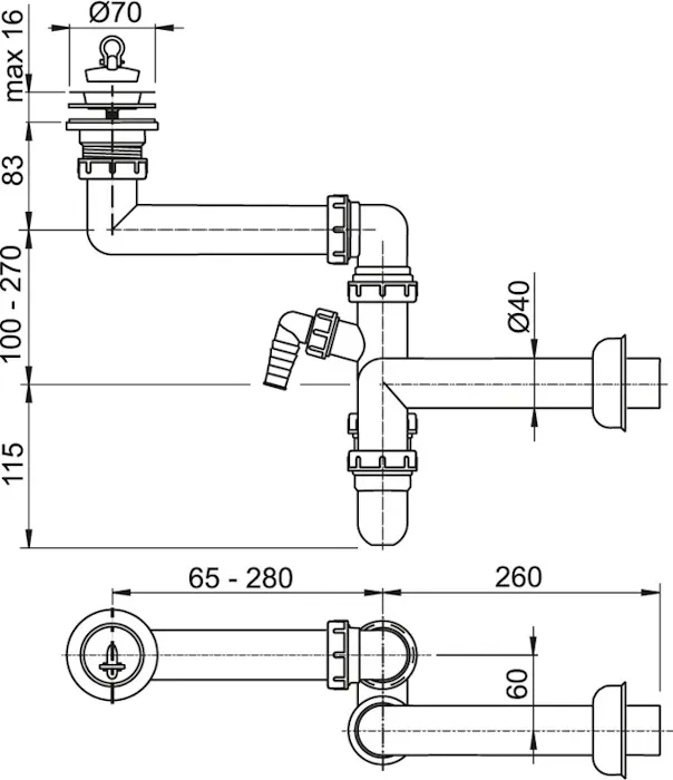 Prostorově úsporný dřezový sifon O40 s přípojkou