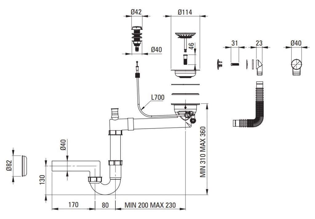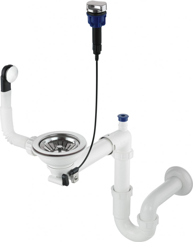 Sifon je určen pro zapuštěný, jednomiskový granitový dřez. Sada se sifonem obsahuje automatickou zátku a kulatý přepad s uzávěrem. Jedná se o prostorově úsporný model Space-Saver.