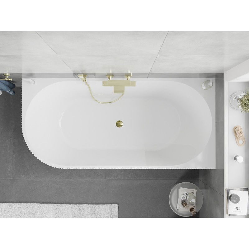 Specifikace produktu: Rozměr: 150 x 75 cm Výška: 58 cm Hloubka: 42,5 cm Montáž: Rohová, Levá Materiál: Sanitární akrylát Barva: Bílá Povrchová úprava: Zlatá Struktura: Drážkovaná Otvor pro přepad: Ano Otvor pro baterii: Ne Sifon a zátka click-clack jsou součástí dodávky Odolné vůči baterii, baterii a UV záření