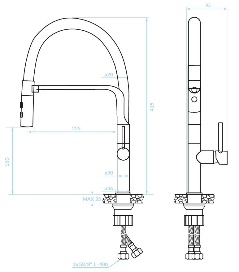 Klíčovým prvkem je flexibilní výtok s magnetickým uchycením, který zajišťuje pohodlnou manipulaci a přesné směrování proudu vody. Ideální je pro plnění velkých hrnců, mytí ovoce i zeleniny nebo úklid dřezu.
