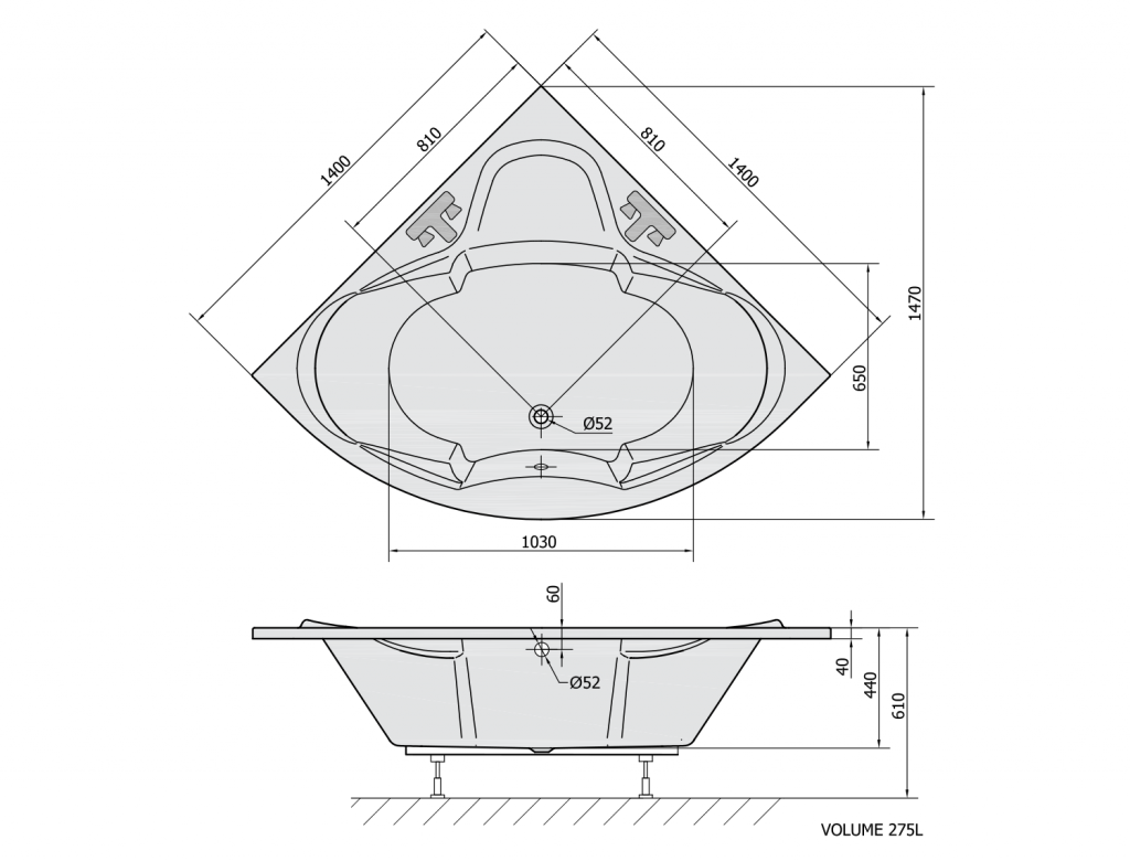 Vana s pohodlně tvarovanými stěnami pro opření zad na obou stranách a odtokem umístěným uprostřed.