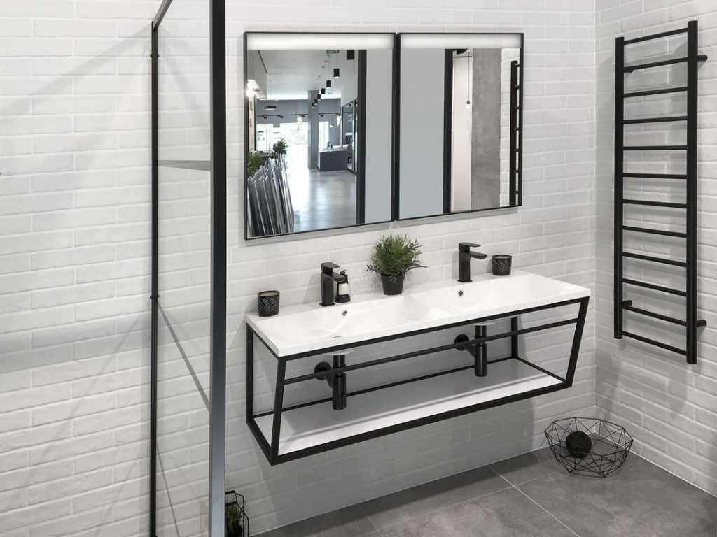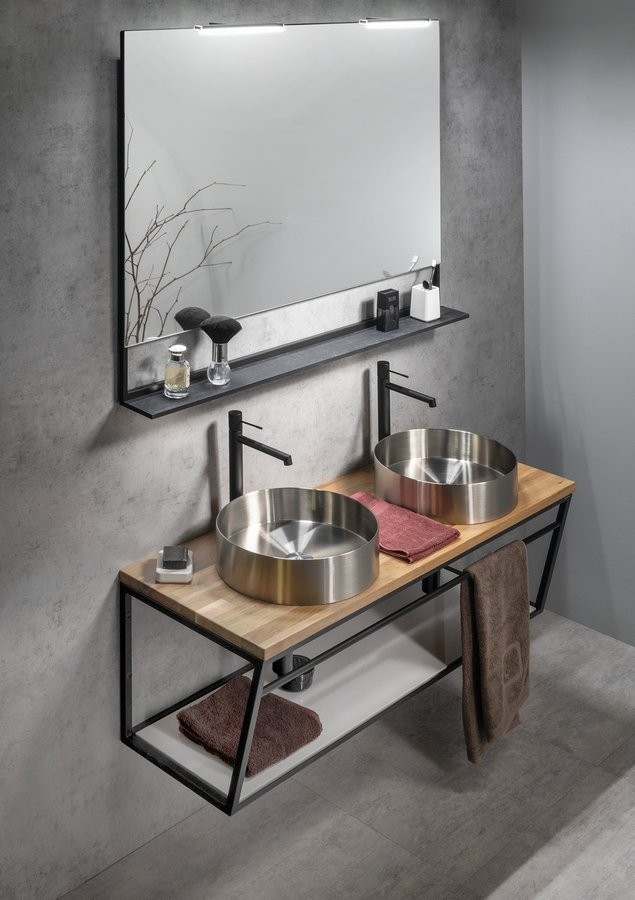 - Konstrukce pod umyvadlo, s bílou policí z lakované MDF desky.