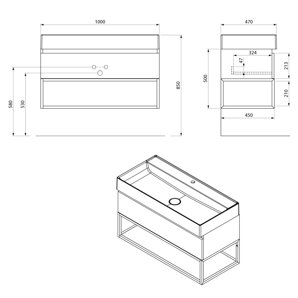Závěsné konstrukce v šířkách 60, 80 a 100 cm jsou jsou určeny pro umyvadlo TWIG z litého mramoru v bílé barvě. V nabídce jsou i konstrukce určené výhradně k instalaci s rockstone deskou v šířkách 70 až 100 cm.