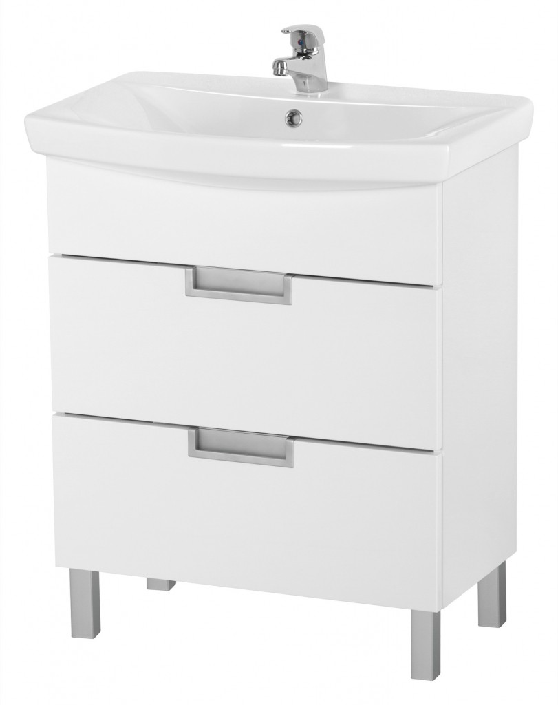 Skříňka DAHLIA pod umyvadlo CARINA s bílým lesklým povrchem a chronovými úchytkami. Skříňka má dvě zásuvky a je vhodná zejména do větší koupelny. Lze instalovat na stěnu nebo s nožičkami.