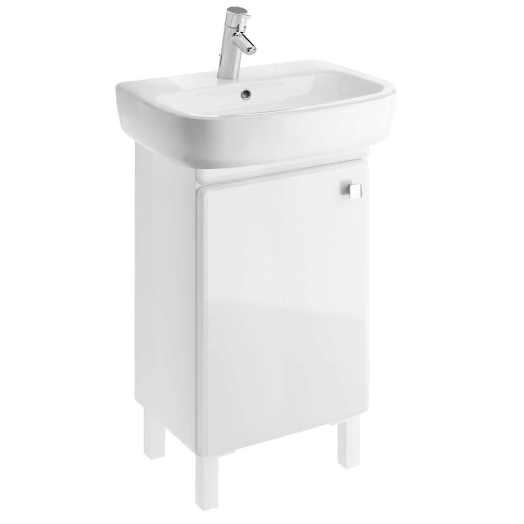 Závěsná umyvadlová skříňka IBU bílé barvy s lesklým povrchem, doplněna stříbrným madlem. Dvířka mají univerzální montáž pravá/levá. SKříňku lze instalovat na stěnu nebo s nožičkami, které nejsou součástí a lze je doobjenat níže v souvisejícím zboží.