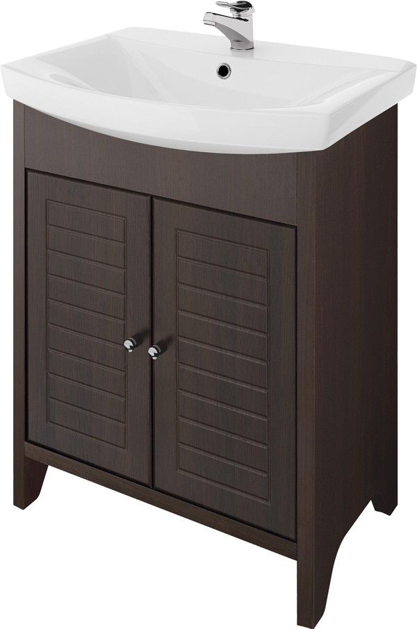 Umyvadlová skříňka MOCCA v provedení tmavého kaštanu. Skříňka má dvě dvířka a jednu poličku uvnitř. Skříňka je díky svým rozměrům vhodná zejména do větších prostor koupelny.