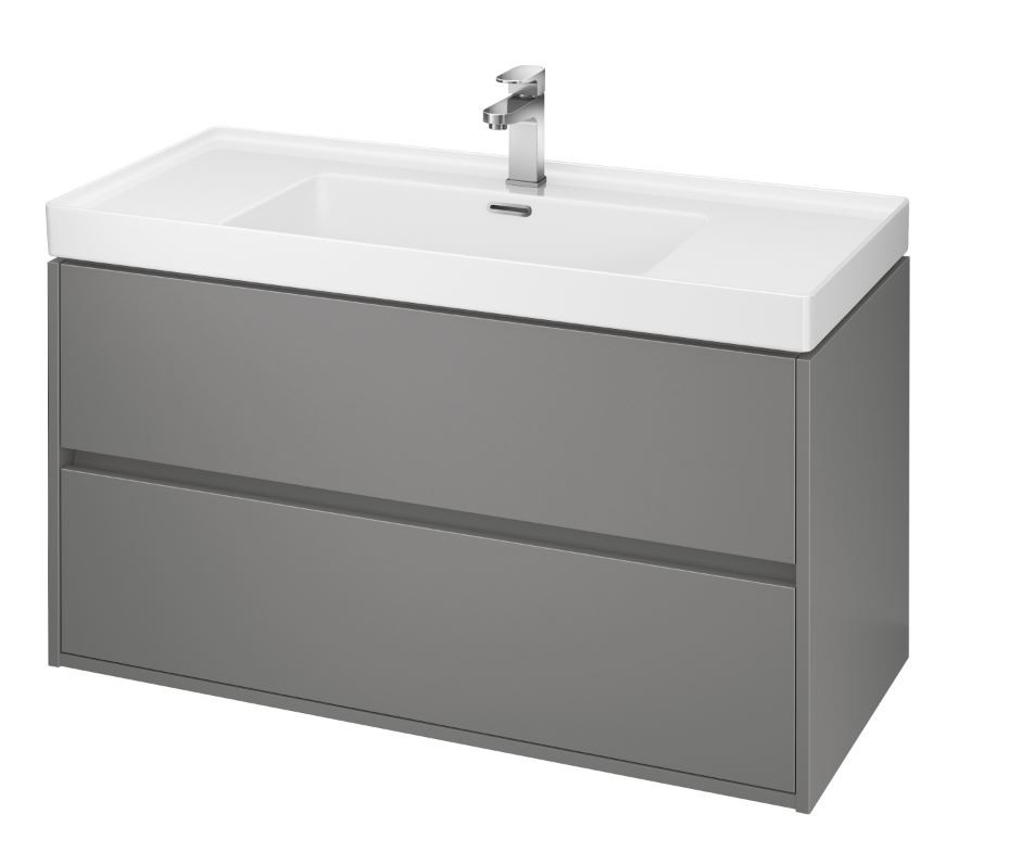 Závěsná umyvadlová skříňka CREA 100 se dvěma výsuvnými boxy v šedém matném provedení a elegantním šedým lněným vnitřkem. Vyrobená je z dřevotřískových desek s moderní technologií AQUASAFE /zvýšená odolnost proti vlhkosti/. Skříňka působí elegantním vzhledem díky zapuštění přední části a využití skrytých madel. Zásuvky jsou vybavené pojezdy "HAFELE" s plným výsuvem a tichým uzavíracím systémem, který zvyšuje komfort používání. Skříňka lze kombinovat s umyvadly CREA a COMO.