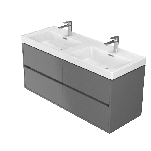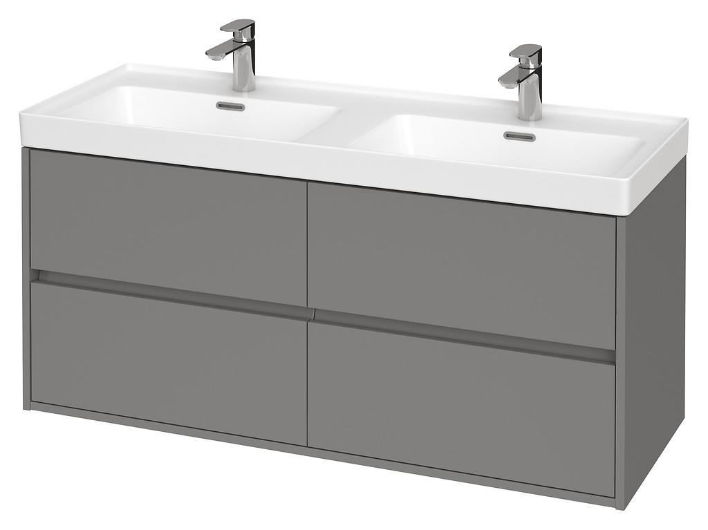 Závěsná dvojumyvadlová skříňka CREA 120 se čtyřmi výsuvnými boxy v provedení šedá mat, vyrobená moderní technologií AQUASAFE /zvýšená odolnost proti vlhkosti/. Skříňka působí elegantním vzhledem díky zapuštění přední části a využití skrytých madel. Zásuvky jsou vybavené pojezdy "HAFELE" s plným výsuvem a tichým uzavíracím systémem, který zvyšuje komfort používání.
