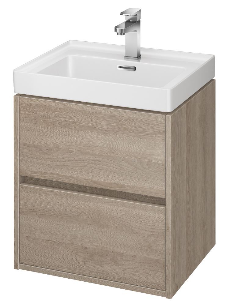 Závěsná umyvadlová skříňka CREA 50 se dvěma výsuvnými boxy v dubovém provedení a elegantním šedým lněným vnitřkem. Vyrobená je z dřevotřískových desek s moderní technologií AQUASAFE /zvýšená odolnost proti vlhkosti/. Skříňka působí elegantním vzhledem díky zapuštění přední části a využití skrytých madel. Zásuvky jsou vybavené pojezdy "HAFELE" s plným výsuvem a tichým uzavíracím systémem, který zvyšuje komfort používání. Skříňka lze kombinovat s umyvadly CREA, MODUO, CITY, COMO a COLOUR.