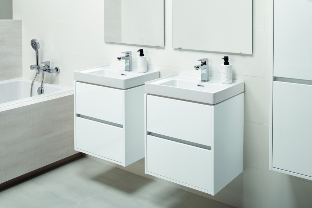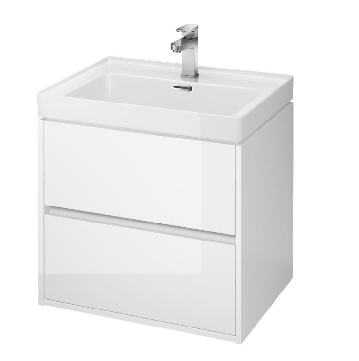 Závěsná umyvadlová skříňka CREA 60 se dvěma výsuvnými boxy v bílém lesklém provedení a elegantním šedým lněným vnitřkem. Vyrobená je z dřevotřískových desek s moderní technologií AQUASAFE /zvýšená odolnost proti vlhkosti/. Skříňka působí elegantním vzhledem díky zapuštění přední části a využití skrytých madel. Zásuvky jsou vybavené pojezdy "HAFELE" s plným výsuvem a tichým uzavíracím systémem, který zvyšuje komfort používání. Skříňka lze kombinovat s umyvadly CREA, MODUO, CITY, COMO a COLOUR.