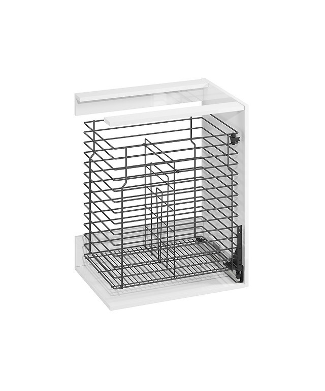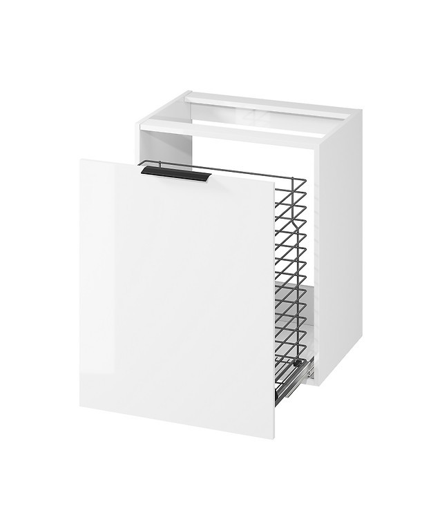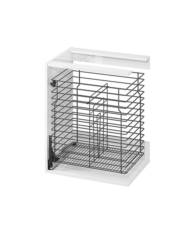 Skříňka s dvoudílným košem pod pracovní desku je estetickým místem pro uložení prádla, které pomůže vnést pořádek do vašeho oblečení. Kovový koš v černém provedení má 2 komory, které usnadní oddělení oblečení a dvířka jsou opatřena systémem soft-close /měkké dovírání/. Korpus a čelo skříně jsou vyrobeny z dřevotřískové desky. Samostatně je možné dokoupit černé a stříbrné úchyty a ozdobné nožky ve stejné barvě jako madla.