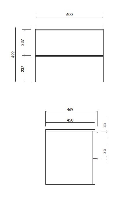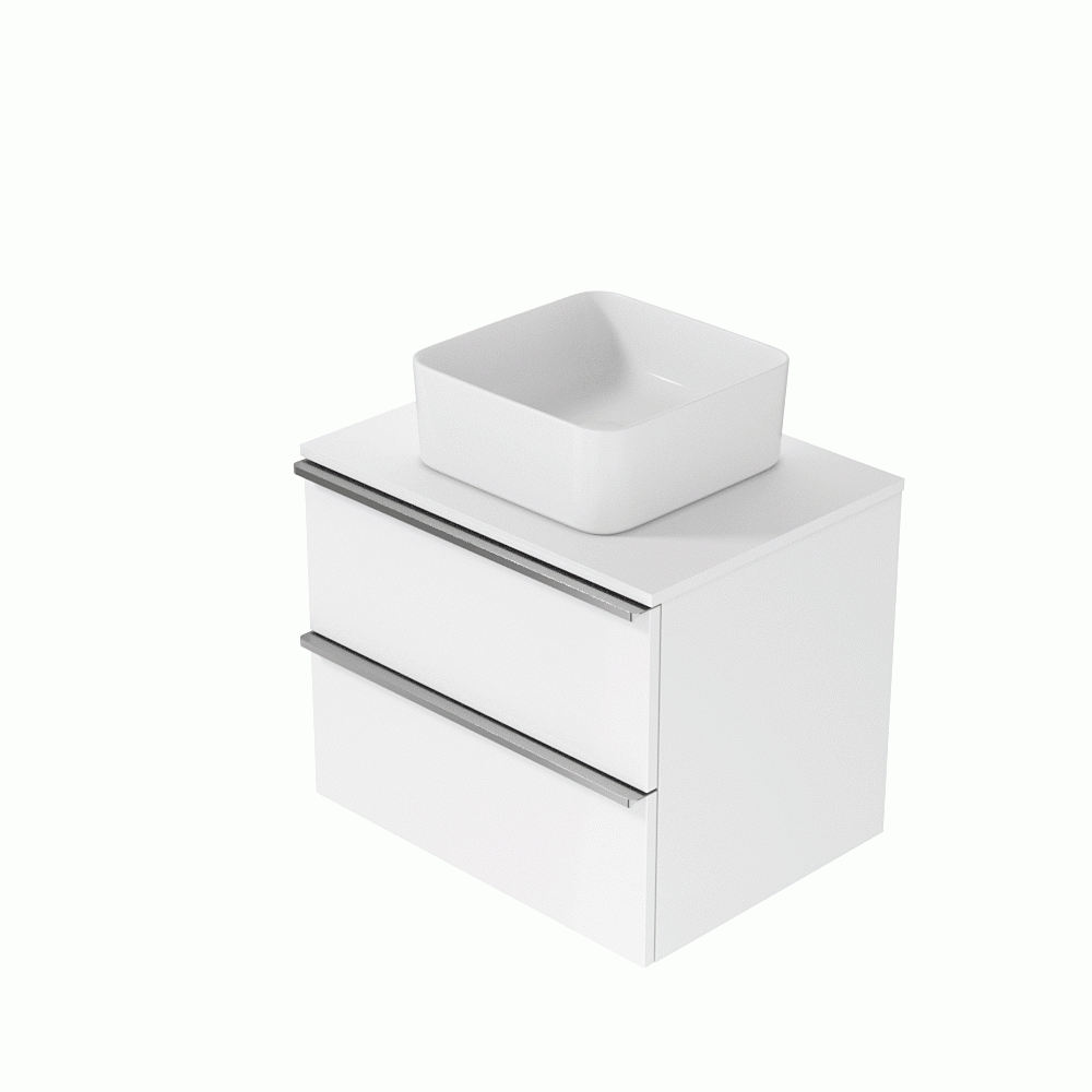 Závěsná elegantní skříňka VIRGO pro umyvadla na desku je vyrobena z bílé lakované dřevotřískové desky s lesklým povrchem. Dvě praktické zásuvky jsou vybaveny systémem „soft-close“. Uvnitř horní zásuvky je výřez pro sifon s krytem a spodní části zásuvek jsou pokryty jemnou šedou lněnou strukturou.