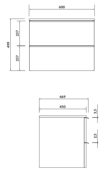 Závěsná elegantní skříňka VIRGO pro umyvadla na desku je vyrobena z bílé lakované dřevotřískové desky s lesklým povrchem. Dvě praktické zásuvky jsou vybaveny systémem „soft-close“. Uvnitř horní zásuvky je výřez pro sifon s krytem a spodní části zásuvek jsou pokryty jemnou šedou lněnou strukturou.