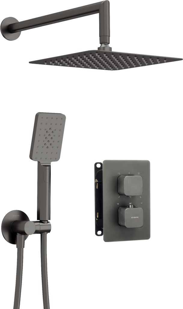 Tato podomítková sprchová sada kombinuje moderní technologii s nadčasovou estetikou. Obsahuje přesný termostatický bateriový bateriový systém, obdélníkovou sprchovou hlavici a ruční sprchu s příjemným dešťovým proudem vybavenou systémem Anti-Calc, který účinně snižuje usazování vodního kamene. Výběrem kompletní sady si můžete být jisti, že všechny komponenty do sebe dokonale zapadají a vytvářejí ucelený celek. Podomítková instalace zaručuje maximální minimalismus a vizuální pořádek ve sprchovém prostoru, zatímco titanová povrchová úprava doplňuje klasický i moderní interiér. Toto řešení kombinuje funkčnost, pohodlí a estetiku na nejvyšší úrovni.