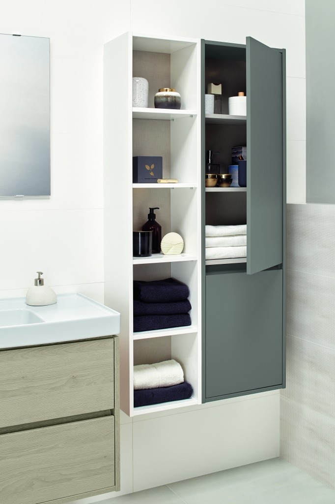Závěsný otevřený nábytkový sloupek CREA v bílém provedení a elegantním šedým lněným vnitřkem. Skříňka je vyrobena z dřevotřískové desky s moderní technologií AQUASAFE /zvýšená odolnost proti vlhkosti/. Výhodou sloupku je nastavitelný závěsný mechanismus.