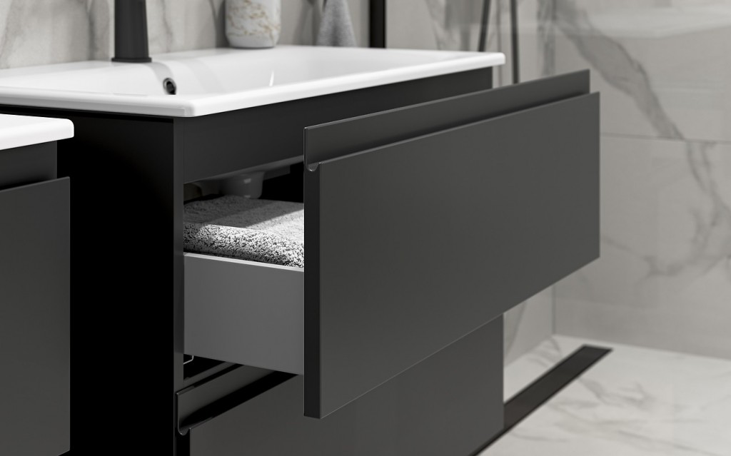 MODUO nabízí funkční řešení jak pro malou koupelnu, tak pro velkou rodinnou koupelnu. Prostorné zásuvky, závěsné skříňky a prvky v dubové barvě jsou