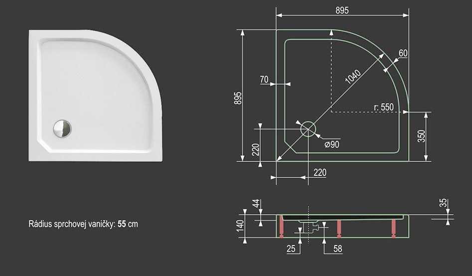 Sprchová vanička z tvrzeného polymeru - s antibakteriální úpravou povrchu. Dodávána s plastovým sifonem A49CR, s chromovou krytkou.