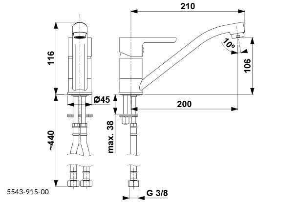 Stojánková dřezová baterie SODALIT od výrobce KFA ARMATURA s otočným ramínkem a délkou 210 mm.