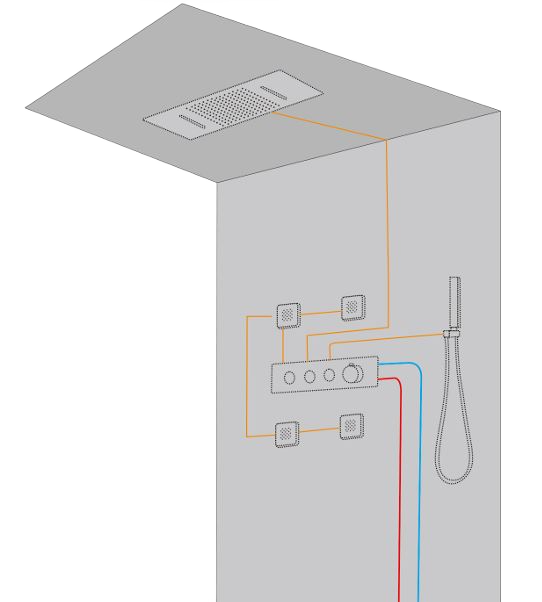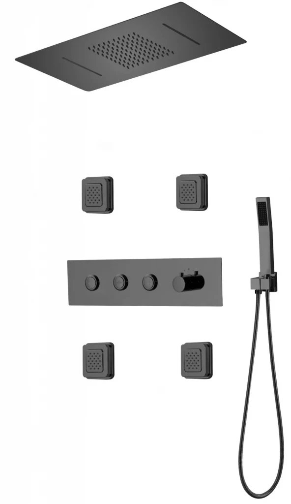 Jedná o moderní sprchový systém SOLER vyrobený z nerezové oceli s černou povrchovou úpravou. Skládá se z více komponentů a součástí je horní 3 funkční (déšť, kaskádový proud) sprchové hlavice, nástěnných trysek, ovládacího panelu a ruční jedno funkční sprchy.