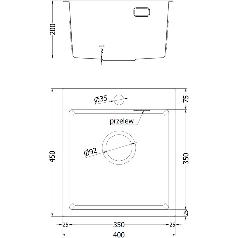 Specifikace produktu: Rozměr: 400x450x200 mm Hloubka dřezu: 200 mm Rozměry dřezu: 350x350 mm Tloušťka ocelového hran dřezu: 3 mm Tloušťka ocelového hran dřezu: 1 mm Poloměr zaoblení rohů dřezu: R10 Průměr odtoku: ø92 mm Typ: 1-dřez Typ: Vestavný Materiál: Nerezová ocel AISI 304 Barva: Zlatá Povrch: Hladký Povrchová úprava sifonu: Zlatá Otvor pro přepad: Ano Otvor pro baterii: Ano Ruční sifon s odpadkovým košem a zátkou Přídavný kryt odtoku Skrytý otvor pro přepad Zvukově izolační rohože k dřezu Odolnost vůči nárazům, poškrábání a změně barvy Odolnost vůči vysokým teplotám a tepelným šokům Snadno čistitelný povrch