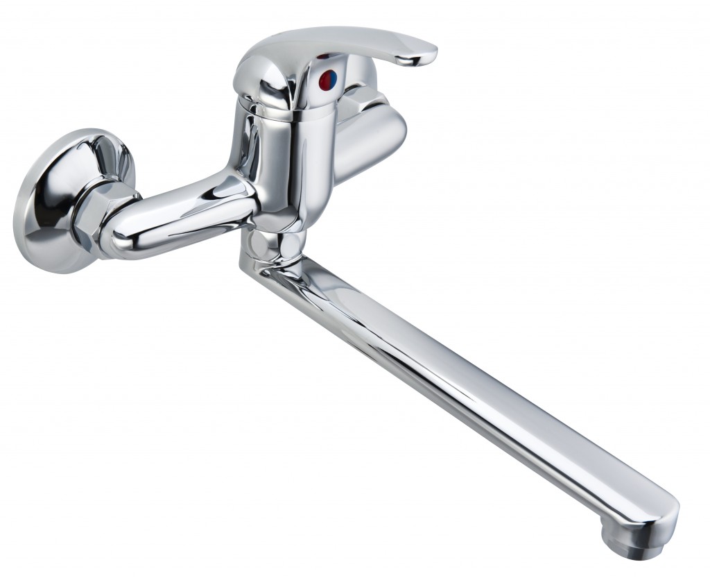 Nástěnná dřezová baterie SOTALIA od výrobce KFA ARMATURA s roztečí 150 mm. Výhodou je otočné ramínko o délce 200 mm a perlátorem.
