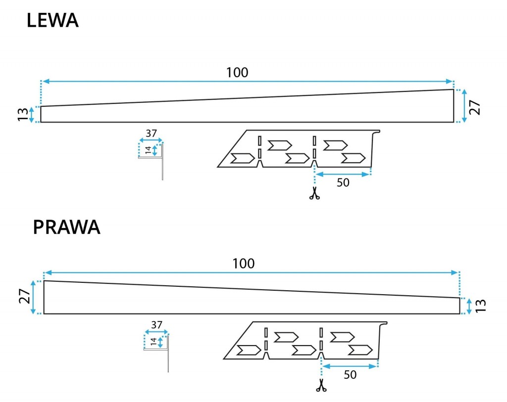 Spádové lišty jsou jsou dostupné v pravém nebo levém provedení. Jaké provedení potřebujete poznáte pokud stojíte u sprchového koutu a díváte se ve směru spádu ke kanálku, tak pokud potřebujete profil na levou stranu, je to levý, pokud na pravou stranu, je to pravý.