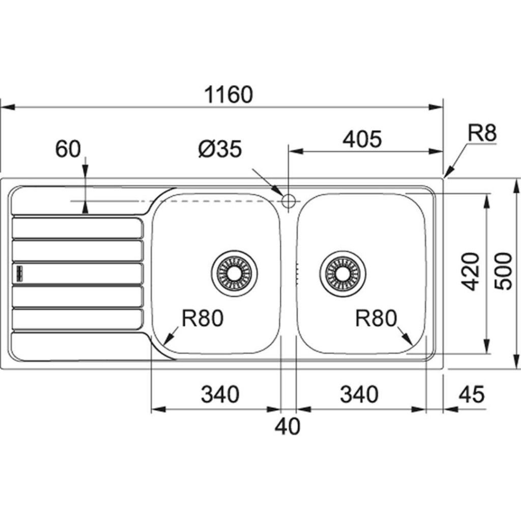 - 2 dřezy o velikosti: 420 x 340 mm