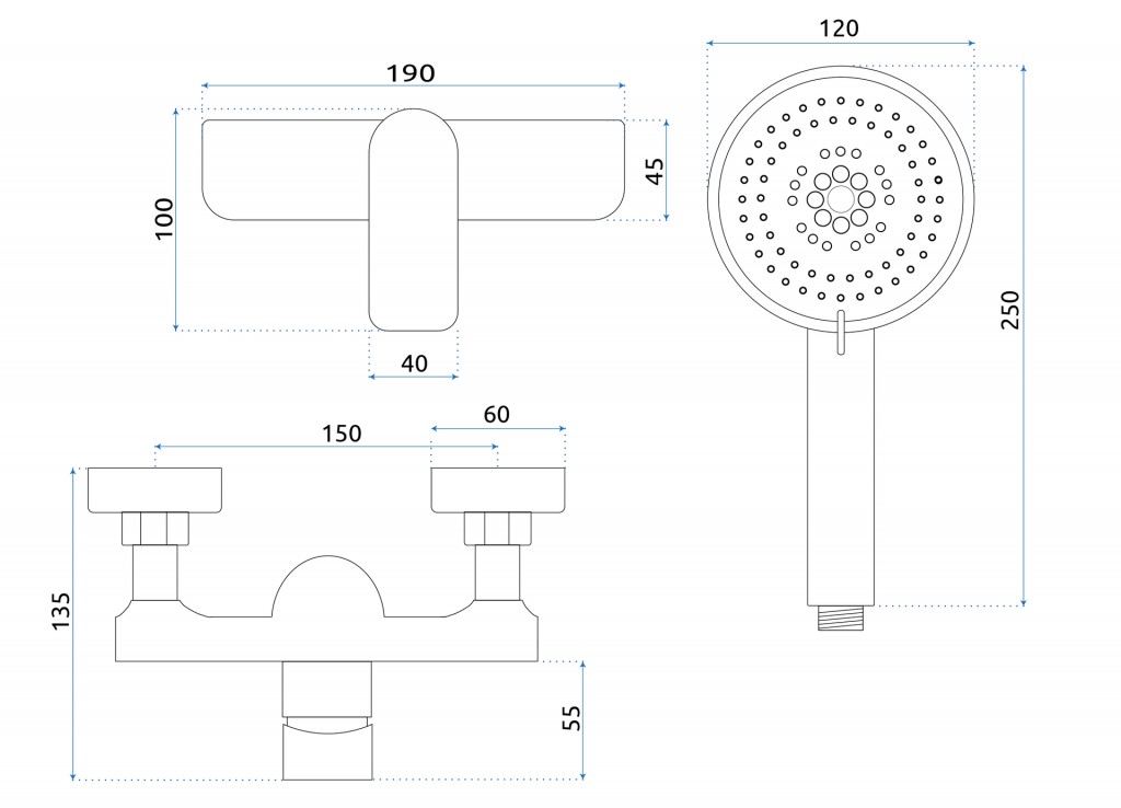 Součástí baterie je ruční sprcha s jednou funkcí, vyrobená z ABS, kterou lze usadit do nástěnného držáčku a hadice délky 150 cm.