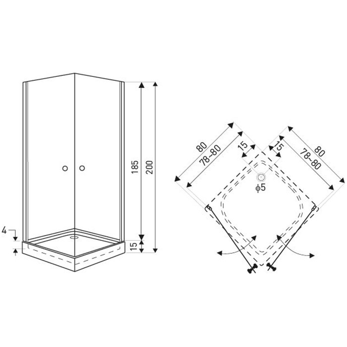 Čtvercový sprchový kout je dodávaný se sprchovou vaničkou o rozměrech 80 x 80 x 15 cm. K vaničce je potřeba dokoupit sifon – doporučujeme model Speed s průměrem 50 mm pro optimální odvod vody.