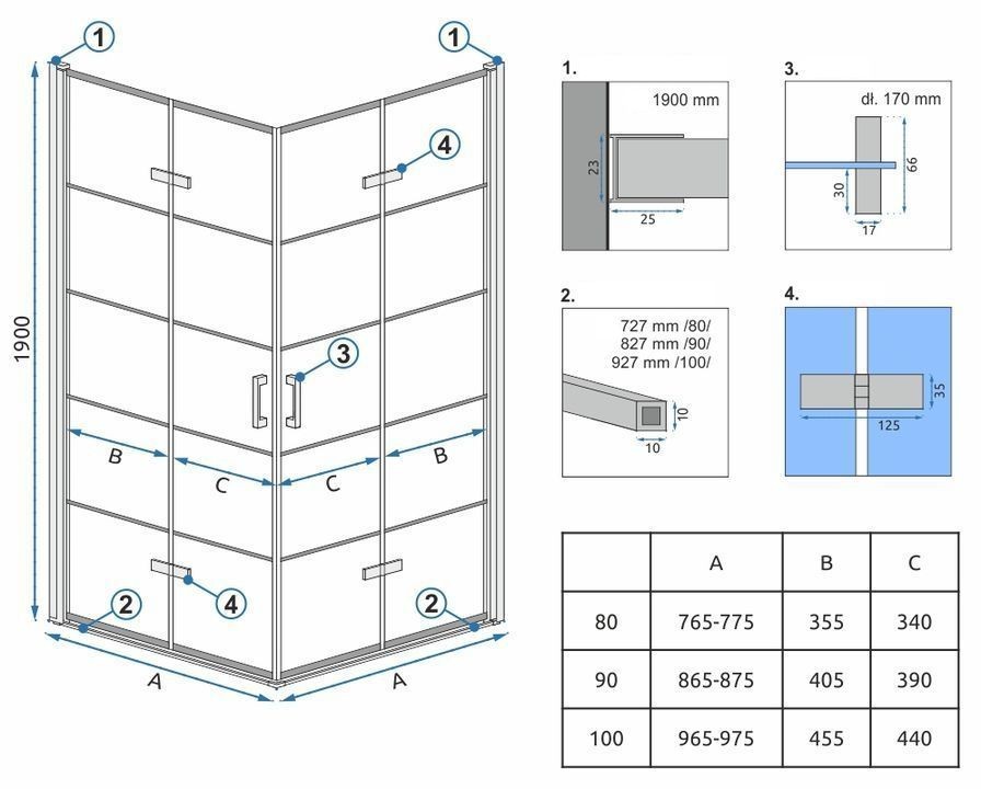 Exkluzivní model sprchového koutu Rea Molier Double je složen ze dvou zalamovacích sprchových dveří, které jsou vyrobeny z vysoce kvalitního 6 mm bezpečnostního skla s povrchovou úpravou CrystalClear a s laserem nanášeným povrchem EasyClean. Povlak sprchových dveří byl nanesen na obě dvě strany, takže je možné dveře u obdélníkových variant namontovat vpravo i vlevo.