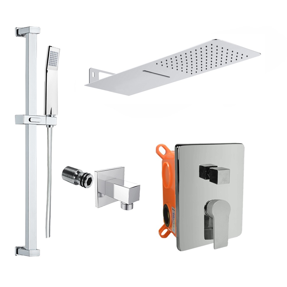 Součástí setu je talířová sprcha s vodopádem 500x200 mm, posuvný držák sprchy, jednopolohová sprcha, plastová šedostříbrná hadice 150 cm, stěnový vývod.