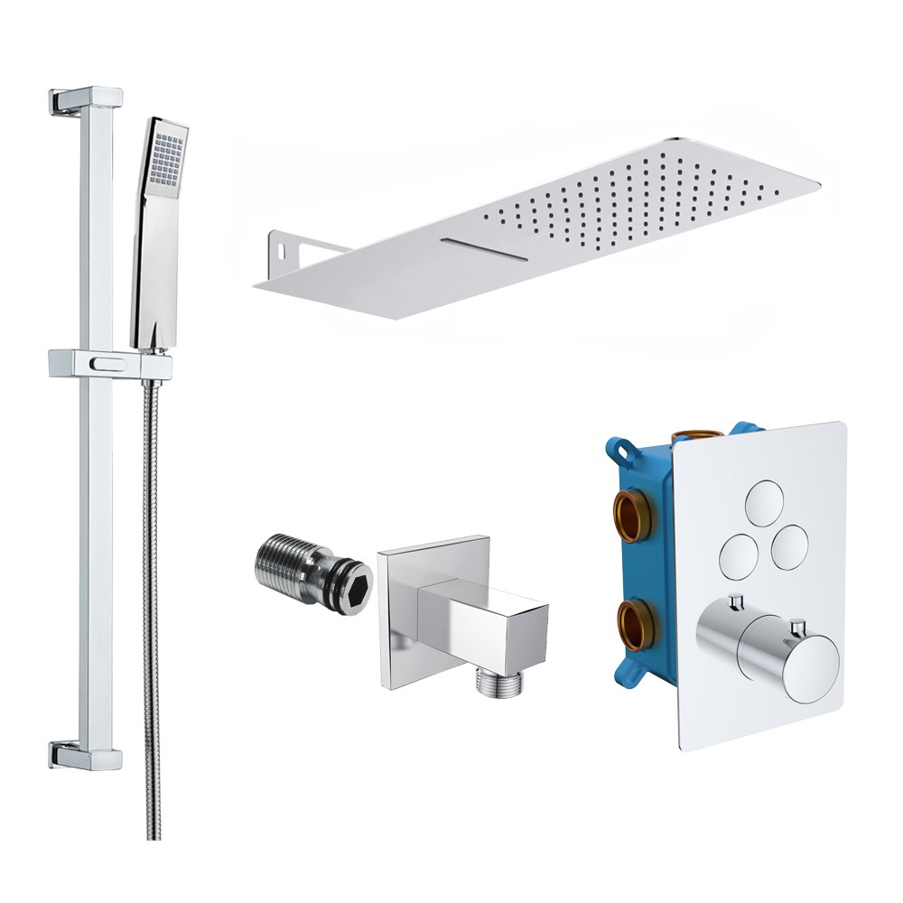 Součástí setu je talířová sprcha s vodopádem 500x200 mm, posuvný držák, jednopolohová sprcha, dvouzámková nerez hadice 150 cm, stěnový vývod.