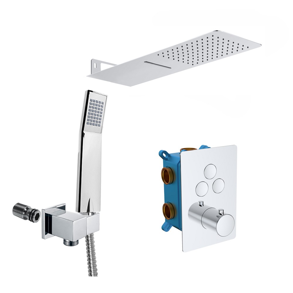 Součástí setu je talířová sprcha s vodopádem 500x200 mm, jednopolohová sprcha, dvouzámková nerez hadice 150 cm, stěnový vývod s držákem.