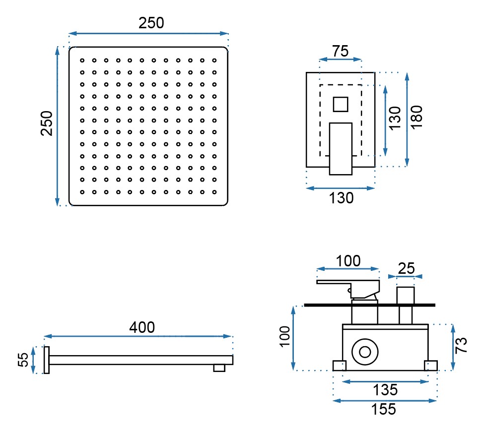| Balení | skrytá baterie, dešťová sprcha, rameno k dešťové sprše, 1500 mm hadice, sluchátko, držák sluchátka, mřížky, box |