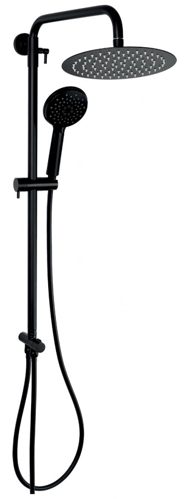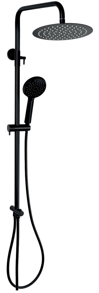 Prvotřídní provedení černá-mat. Set je vhodný pro připojení k vanové nebo sprchové baterii se spodním vývodem. Součástí balení je hlavová sprcha ve SLIM DESIGN s průměrem 250 mm, hadice 150 cm a 3-polohová ruční sprcha. Nastavitelná výška setu je 890 - 1300 mm. Součástí balení je připojovací hadička v délce 70 cm.Parametry