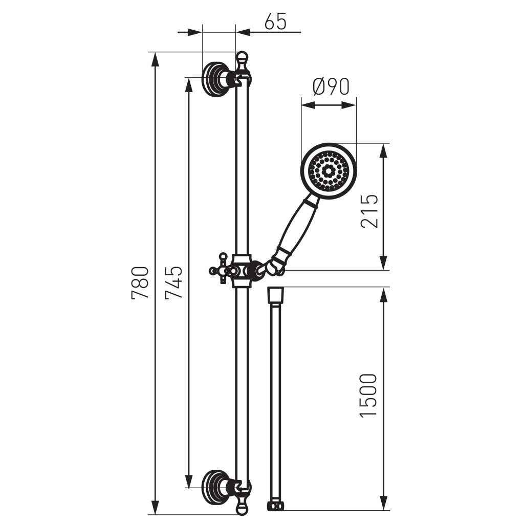 Sprchová souprava pro sprchové baterie obsahuje 1-polohovou ruční sprchu, posuvný držák sprchy v délce 780 mm a kovovou sprchovou hadici v délce 150 cm.Rozteč montážních otvorů 745 mm