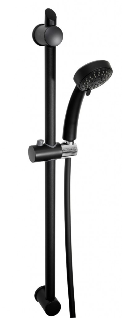 Sprchová souprava v provedení černá-mat pro sprchové baterie obsahuje 3-polohovou ruční sprchu, posuvný držák sprchy v délce 740 mm a plastovou sprchovou hadici s anti-twist v délce 150 cm. Průměr tyče 25 mm.Nastavitelná rozteč montážních otvorů až 660 mm.