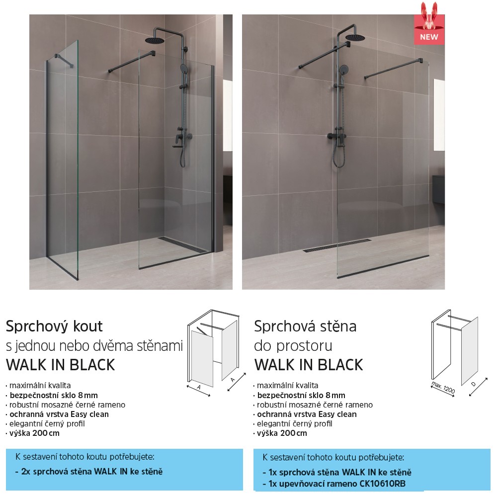 Sprchové stěny WALK IN jsou jediné, které se vám opravdu přizpůsobí. Sestavte si svůj sprchovací prostor na míru. Sprchový kout typu WALK IN si můžete poskládat v několika možných kombinacích. Stabilitu bezpečnostní skla zajišťuje elegantní kovová vzpěra a v případě montáže na zeď i boční stavitelný profil, které nenarušují designovou čistotu celého koutu, nejedná o hermeticky uzavřený výrobek.
