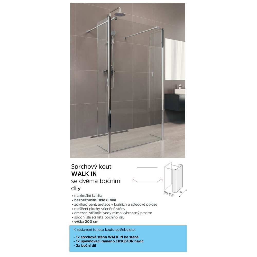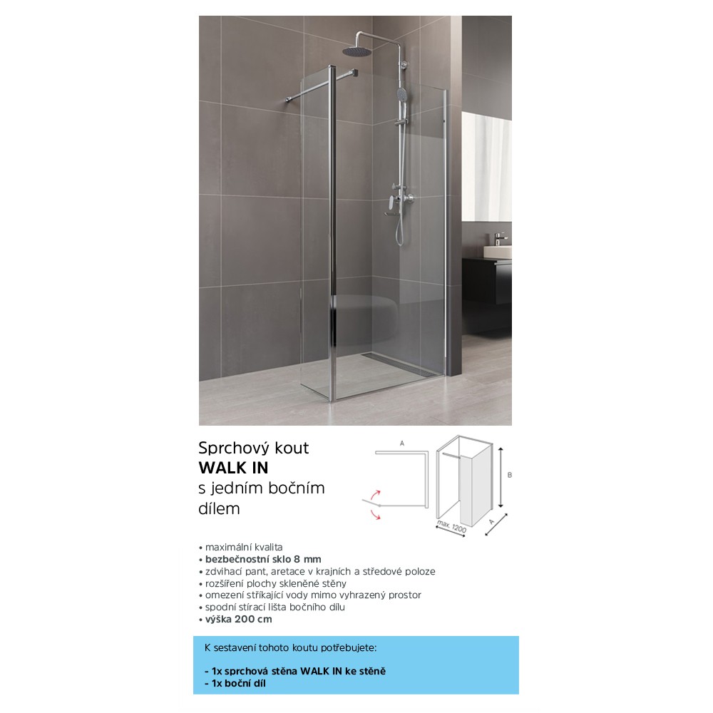 Boční stěna s profilem k sprchovým stěnám WALK IN s možností polohování. Součástí bočního dílu je rohový profil s pantem, který umožňuje částečně uzavřít sprchovací prostor, nebo rozšířit délku sprchovací stěny WALK IN.