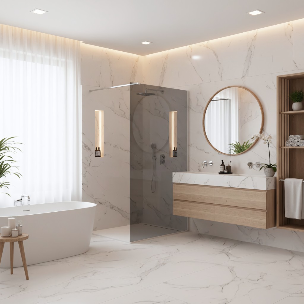 Walk-In konstrukce – prostorný bezbariérový vstup, který zvyšuje komfort a podtrhuje minimalistický vzhled koupelny.